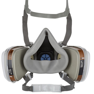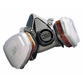 Halbmaske 3M6200 -- 2 Filter 3M6055 A2 gegen organische Gase und Dämpfe für erhöhte Schadstoffkonzentration bis 0,5Vol.% -- 2 Filter 3M5925 P2 gegen Feinstäube bis zum 10-fachen des MAK-Wertes -- 2 Filterdeckel 3M501