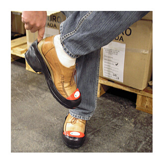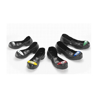 Turbo-toe safety overshoe, ideal for visitors or short use, robust and large steel caps, hygienic and easy to use, anti-slip PVC sole, in six different sizes with colour coding.