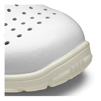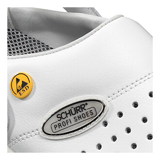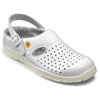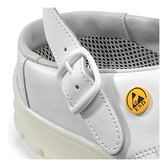 Mule ESD sportive à perforations, tige en microfibre, blanc, lanière de talon rabattable vers l'avant, doublure textile DRY-TEC souple, semelle intérieure PUR confortable, semelle PUR antidérapante, antistatique, protection ESD max. 35 M-Ohm.